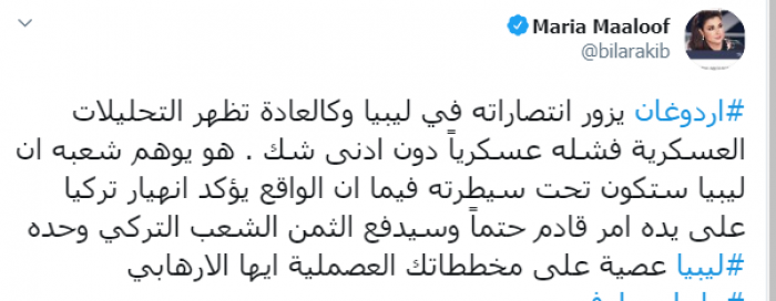 وكتبت معلوف عبر تغريدة لها على "تويتر" رصدها " المشهد العربي": "أردوغان يزور انتصاراته في ليبيا وكالعادة تظهر التحليلات العسكرية فشله عسكرياً دون أدنى شك".