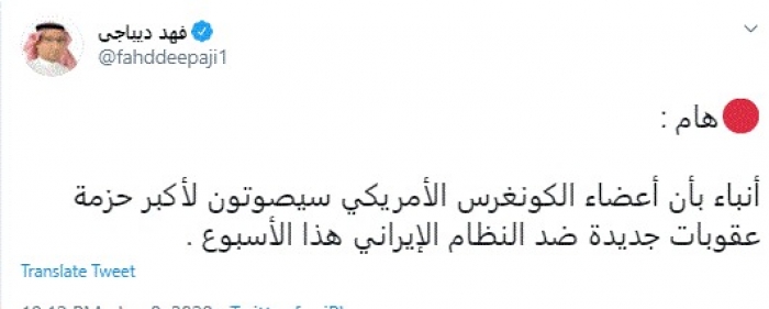 وكتب في تغريدة عبر "تويتر" رصدها "المشهد العربي": "أنباء بأن أعضاء الكونغرس الأمريكي سيصوتون لأكبر حزمة عقوبات جديدة ضد النظام الإيراني هذا الأسبوع".