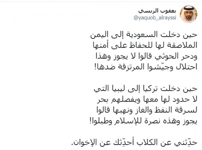 وقال في تغريدة عبر "تويتر" رصدها "المشهد العربي": "حين دخلت السعودية إلى اليمن الملاصقة لها للحفاظ على أمنها ودحر الحوثي قالوا لا يجوز وهذا احتلال وجيّشوا المرتزقة ضدها".