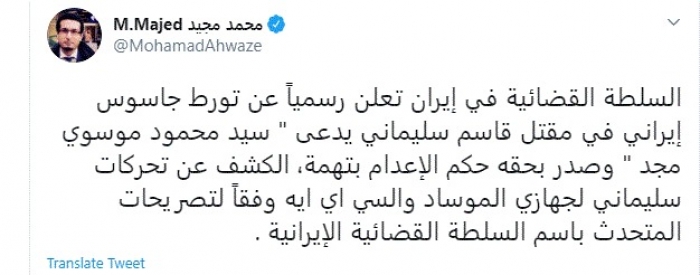 وقال في تغريدة عبر "تويتر" رصدها "المشهد العربي": "السلطة القضائية في إيران تعلن رسمياً عن تورط جاسوس إيراني في مقتل قاسم سليماني يدعى سيد محمود موسوي مجد وصدر بحقه حكم الإعدام بتهمة، الكشف عن تحركات سليماني لجهازي الموساد والسي اي ايه وفقاً لتصريحات المتحدث باسم السلطة القضائية الإيرانية".