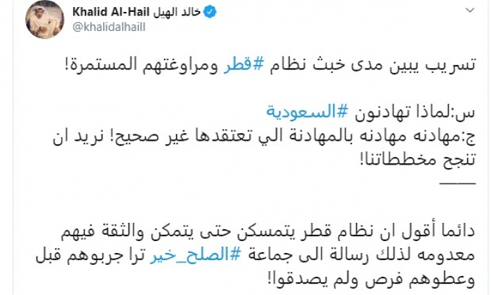 وقال في تغريدة عبر "تويتر" رصدها "المشهد العربي": "تسريب يبين مدى خبث نظام قطر ومراوغتهم المستمرة".