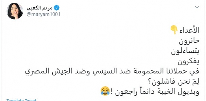 وقالت في تغريدة عبر "تويتر" رصدها "المشهد العربي": "الأعداء حائرون يتساءلون يفكرون في حملاتنا المحمومة ضد السيسي وضد الجيش المصري لِمَ نحن فاشلون؟ وبذيول الخيبة دائماً راجعون".