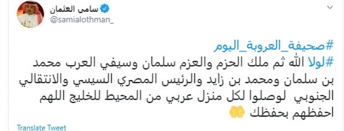 وقال في تغريدة عبر "تويتر" رصدها "المشهد العربي": "لولا الله ثم ملك الحزم والعزم سلمان وسيفي العرب محمد بن سلمان ومحمد بن زايد والرئيس المصري السيسي والانتقالي الجنوبي لوصلوا لكل منزل عربي من المحيط للخليج اللهم احفظهم بحفظك".