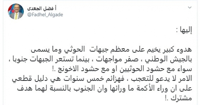 هاجم عضو هيئة رئاسة المجلس الانتقالي الجنوبي فضل الجعدي، اليوم، حكومة الشرعية لعدم وجود مواجهات بينها وبين مليشيات الحوثي الإرهابية، مؤكدًا أن الجنوب بالنسبة لهما هدف مشترك.