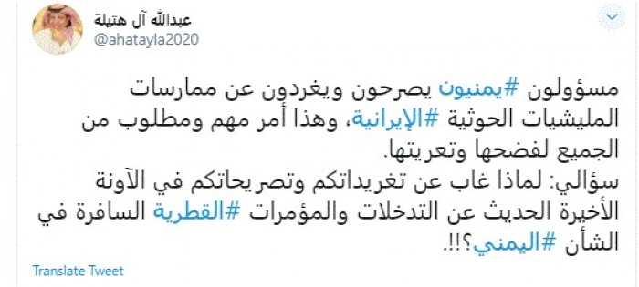وجه الكاتب الصحفي السعودي عبدالله آل هتيلة، اليوم، تساؤلاً لحكومة الشرعية بشأن غياب تغريدات قياداتها عن تدخلات قطر في الشأن اليمني.