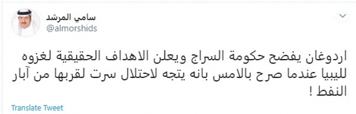 وكتب في تغريدة عبر "تويتر" رصدها "المشهد العربي": "أردوغان يفضح حكومة السراج ويعلن الأهداف الحقيقية لغزوه لليبيا عندما صرح بالأمس بانه يتجه لاحتلال سرت لقربها من آبار النفط".