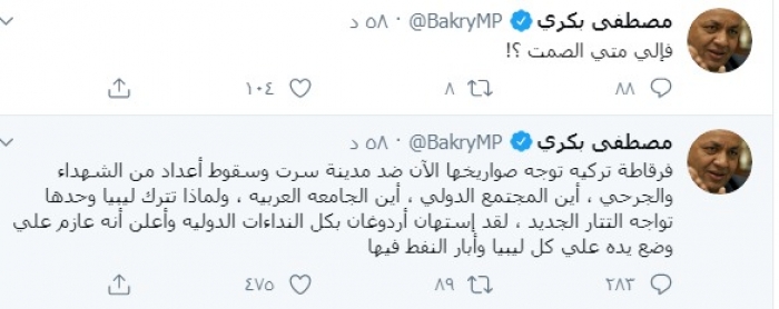 وكتب عبر تغريدة له على "تويتر" رصدها " المشهد العربي": "فرقاطة تركية توجه صواريخها الآن ضد مدينة سرت وسقوط أعداد من الشهداء والجرحي ، أين المجتمع الدولي، أين الجامعة العربية، ولماذا تترك ليبيا وحدها تواجه التتار الجديد".