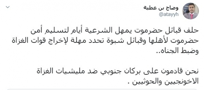 وكتب عبر تغريدة له على "تويتر" رصدها "المشهد العربي": "حلف قبائل حضرموت يمهل الشرعية أياما لتسليم أمن حضرموت لأهلها وقبائل شبوة تحدد مهلة لإخراج قوات الغزاة وضبط الجناة".