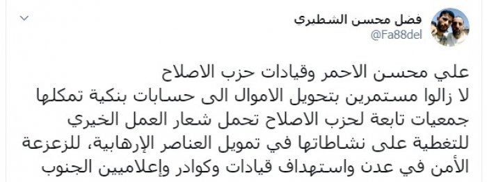 وكتب عبر تغريدة له على "تويتر" رصدها " المشهد العربي": "علي محسن الأحمر وقيادات حزب الإصلاح لا زالوا مستمرين بتحويل الأموال إلى حسابات بنكية تملكها جمعيات تابعة لحزب الإصلاح تحمل شعار العمل الخيري للتغطية على نشاطاتها في تمويل العناصر الإرهابية، لزعزعة الأمن في عدن واستهداف قيادات وكوادر وإعلاميي الجنوب".
