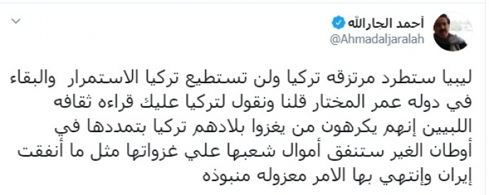 وكتب عبر تغريدة له على "تويتر" رصدها " المشهد العربي":"ليبيا ستطرد مرتزقة تركيا ولن تستطيع تركيا الاستمرار والبقاء في دولة عمر المختار قلنا ونقول لتركيا عليك قراءة ثقافة الليبين، إنهم يكرهون من يغزوا بلادهم".