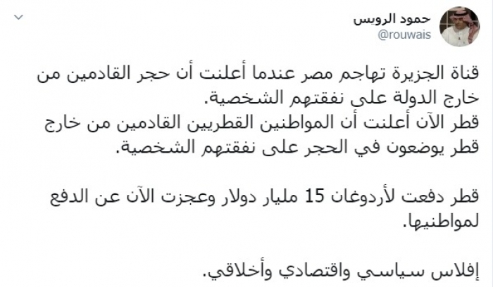 وكتب عبر تغريدة له على "تويتر" رصدها " المشهد العربي": "قناة الجزيرة تهاجم مصر عندما أعلنت أن حجر القادمين من خارج الدولة على نفقتهم الشخصية، قطر الآن أعلنت أن المواطنين القطريين القادمين من خارج قطر يوضعون في الحجر على نفقتهم الشخصية".