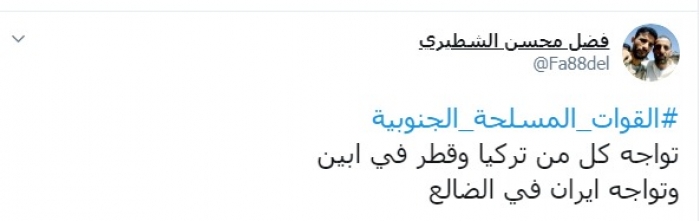 وكتب عبر تغريدة له على "تويتر" رصدها " المشهد العربي": "القوات المسلحة الجنوبية تواجه كلا من تركيا وقطر في أبين وتواجه إيران في الضالع".