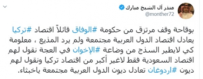 وكتب عبر تغريدة له على "تويتر" رصدها " المشهد العربي": "بوقاحة وقف مرتزق من حكومة الوفاق قائلاً اقتصاد تركيا يعادل اقتصاد الدول العربية مجتمعة ولم يرد المذيع ، معلومة كي لا يطير السذج من وضاعة الإخوان في العجة نقول لهم اقتصاد السعودية فقط لا غير أكبر من اقتصاد تركيا ونقول لهم ديون أردوغان تعادل ديون الدول العربية مجتمعة يا خبثاء".