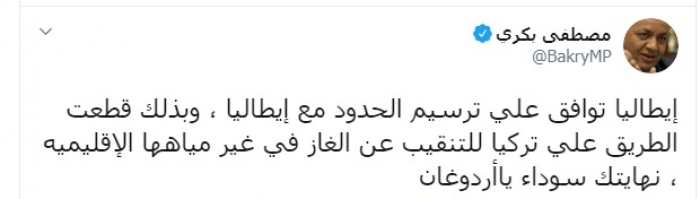 وكتب عبر تغريدة له على "تويتر" :"إيطاليا توافق علي ترسيم الحدود مع اليونان ، وبذلك قطعت الطريق علي تركيا للتنقيب عن الغاز في غير مياهها الإقليمية ، نهايتك سوداء يا أردوغان".