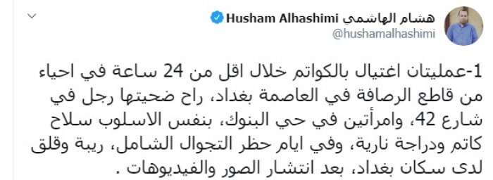 وكتب عبر تغريدات له على "تويتر" رصدها " المشهد العربي": "عمليتان اغتيال بالكواتم خلال أقل من 24 ساعة في أحياء من قاطع الرصافة في العاصمة بغداد، راح ضحيتها رجل في شارع 42، وامرأتين في حي البنوك، بنفس الأسلوب سلاح كاتم ودراجة نارية، وفي أيام حظر التجوال الشامل، ريبة وقلق لدى سكان بغداد، بعد انتشار الصور والفيديوهات" .