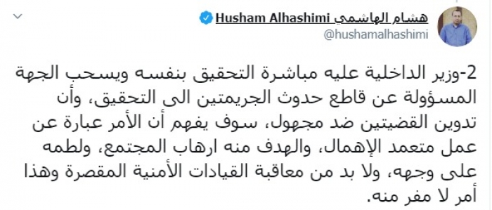 وأضاف:"وزير الداخلية عليه مباشرة التحقيق بنفسه ويسحب الجهة المسؤولة عن قاطع حدوث الجريمتين إلى التحقيق، وأن تدوين القضيتين ضد مجهول، سوف يفهم أن الأمر عبارة عن عمل متعمد الإهمال، والهدف منه إرهاب المجتمع، ولطمه على وجهه، ولا بد من معاقبة القيادات الأمنية المقصرة وهذا أمر لا مفر منه".