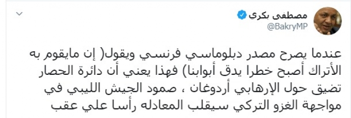 وكتب عبر تغريدة له على "تويتر" رصدها " المشهد العربي":"عندما يصرح مصدر دبلوماسي فرنسي ويقول( إن ما يقوم به الأتراك أصبح خطرا يدق أبوابنا)، فهذا يعني أن دائرة الحصار تضيق حول الإرهابي أردوغان ، صمود الجيش الليبي في مواجهة الغزو التركي سيقلب المعادلة رأسا على عقب".