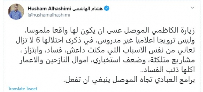 علق الباحث السياسي العراقي هشام الهاشمي، اليوم، على زيارة رئيس الوزراء العراقي مصطفى الكاظمي للموصل.