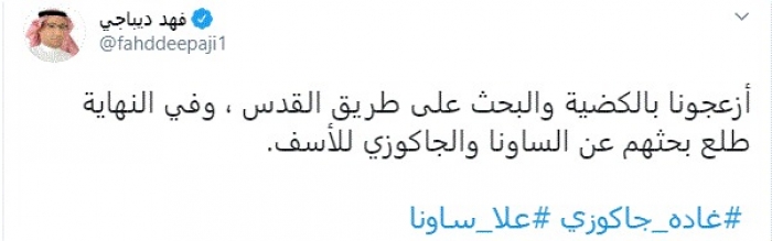 وقال في تغريدة عبر "تويتر" رصدها "المشهد العربي": "أزعجونا بالكضية والبحث على طريق القدس، وفي النهاية طلع بحثهم عن الساونا والجاكوزي للأسف".