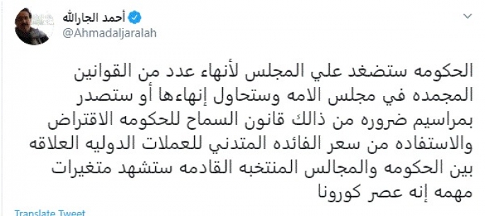 توقع عميد الصحافة الكويتية ورئيس تحرير صحيفة السياسة الكويتية أحمد الجارالله، اليوم، حدوث متغيرات في الكويت جراء أزمة وباء كورونا.