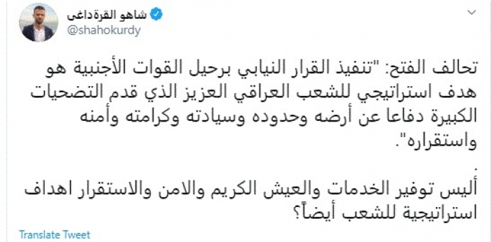 علق الكاتب الصحفي العراقي شاهو القرةداغي، اليوم، على التصريحات التي أطلقها تحالف الفتح بشأن وجود القوات الأمريكية في العراق.