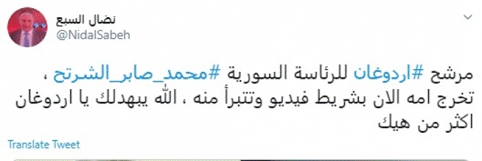 وقال في تغريدة عبر "تويتر" رصدها "المشهد العربي": "مرشح أردوغان للرئاسة السورية محمد صابر الشرتح، تخرج أمه الآن بشريط فيديو وتتبرأ منه، الله يبهدلك يا أردوغان أكثر من هيك".
