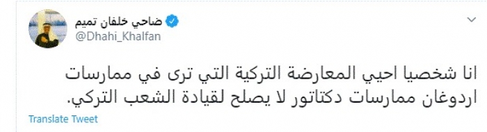 وقال في تغريدة عبر "تويتر" رصدها "المشهد العربي": "أنا شخصيًا أحيي المعارضة التركية التي ترى في ممارسات أردوغان ممارسات ديكتاتور لا يصلح لقيادة الشعب التركي".