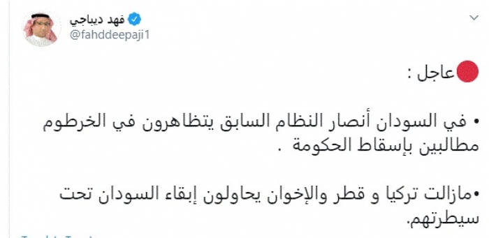 وكتب في تغريدة عبر "تويتر" رصدها "المشهد العربي": "في السودان أنصار النظام السابق يتظاهرون في الخرطوم مطالبين بإسقاط الحكومة مازالت تركيا و قطر والإخوان يحاولون إبقاء السودان تحت سيطرتهم".