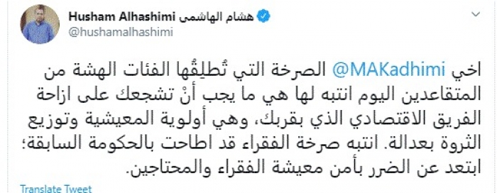 وقال في تغريدة عبر "تويتر" رصدها "المشهد العربي": "أخي مصطفى الكاظمي الصرخة التي تُطلِقُها الفئات الهشة من المتقاعدين اليوم انتبه لها هي ما يجب أنْ تشجعك على إزاحة الفريق الاقتصادي الذي بقربك، وهي أولوية المعيشية وتوزيع الثروة بعدالة".