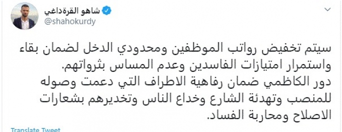 علق الكاتب الصحفي العراقي شاهو القرةداغي، اليوم، على اتجاه الحكومة العراقية لخفض رواتب الموظفين ومحدودي الدخل في العراق.