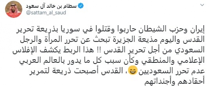 وقال في تغريدة عبر "تويتر" رصدها "المشهد العربي": "إيران وحزب الشيطان حاربوا وقتلوا في سوريا بذريعة تحرير القدس واليوم مذيعة الجزيرة تبحث عن تحرر المرأة والرجل السعودي من أجل تحرير القدس".