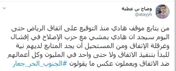 وكتب عبر تغريدة له على "تويتر" رصدها " المشهد العربي": "من يتابع موقف هادي منذ التوقيع على اتفاق الرياض حتى اليوم سيجد أن هادي يمشي مع حزب الإصلاح في إفشال وعرقلة الاتفاق ومن المستحيل أن يجد المتابع لديهم نية للبدء بتنفيذ الاتفاق ولا حتى واحد في المليون وكل أعمالهم ضد الاتفاق ويعملون عكس ما يقولون".