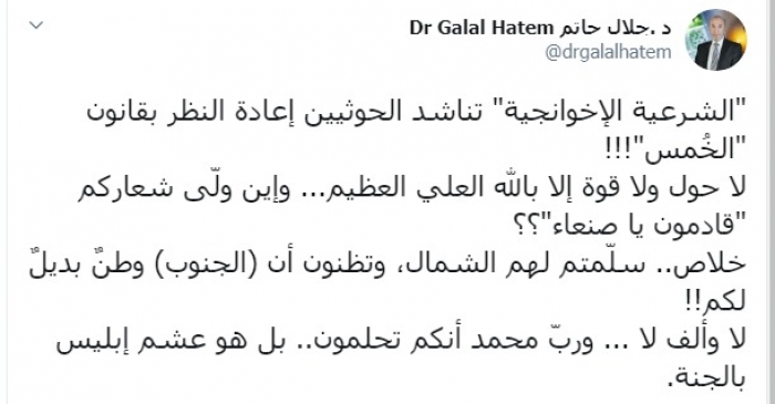 وكتب عبر تغريدة له على "تويتر" رصدها " المشهد العربي": "الشرعية الإخوانجية" تناشد الحوثيين إعادة النظر بقانون "الخُمس"، لا حول ولا قوة إلا بالله العلي العظيم، وأين ولّى شعاركم "قادمون يا صنعاء"؟؟".