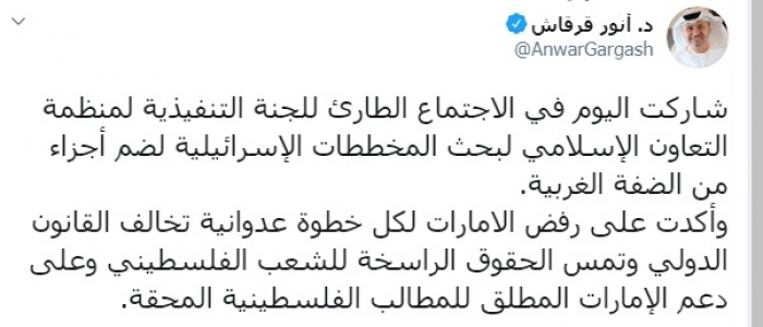 وكتب عبر تغريدة له على "تويتر" رصدها " المشهد العربي" :"شاركت اليوم في الاجتماع الطارئ للجنة التنفيذية لمنظمة التعاون الإسلامي لبحث المخططات الإسرائيلية لضم أجزاء من الضفة الغربية".