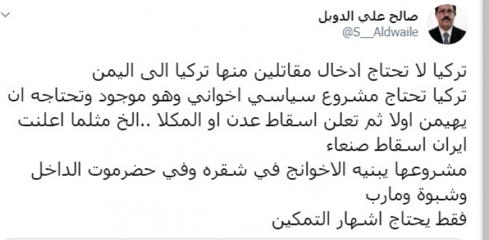 وكتب عبر تغريدة له على "تويتر" رصدها " المشهد العربي": "تركيا لا تحتاج إدخال مقاتلين إلى اليمن، تركيا تحتاج مشروعا سياسيا إخوانيا وهو موجود وتحتاجه أن يهيمن أولا ثم تعلن إسقاط عدن أو المكلا ..إلخ مثلما أعلنت إيران إسقاط صنعاء".