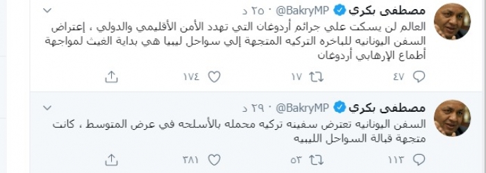 وأضاف: "العالم لن يسكت على جرائم أردوغان التي تهدد الأمن الإقليمي والدولي، اعتراض السفن اليونانية للباخرة التركية المتجهة إلى سواحل ليبيا هي بداية الغيث لمواجهة أطماع الإرهابي أردوغان".