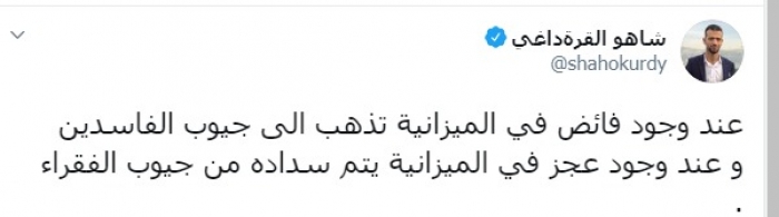 وكتب عبر تغريدة له على "تويتر" رصدها " المشهد العربي": "عند وجود فائض في الميزانية تذهب إلى جيوب الفاسدين، وعند وجود عجز في الميزانية يتم سداده من جيوب الفقراء".