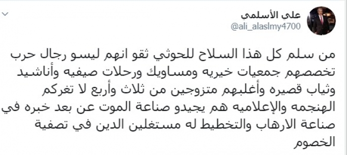 وكتب عبر تغريدة له على "تويتر" رصدها " المشهد العربي":"من سلم كل هذا السلاح للحوثي ثقوا أنهم ليسوا رجال حرب، تخصصهم جمعيات خيرية ومساويك ورحلات صيفية وأناشيد وثياب قصيرة وأغلبهم متزوجون من ثلاث وأربع لا تغركم الهنجمة والإعلامية هم يجيدون صناعة الموت عن بعد خبرة في صناعة الإرهاب والتخطيط له مستغلين الدين في تصفية الخصوم".