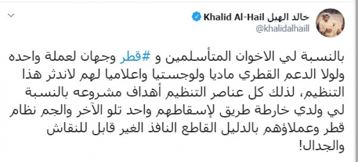 وكتب عبر تغريدة له على "تويتر" رصدها " المشهد العربي":"بالنسبة لي الإخوان المتأسلمين وقطر وجهان لعملة واحدة ولولا الدعم القطري ماديا ولوجستيا وإعلاميا لهم لاندثر هذا التنظيم، لذلك كل عناصر التنظيم أهداف مشروعة بالنسبة لي ولدي خارطة طريق لإسقاطهم واحدا تلو الآخر وألجم نظام قطر وعملاءهم بالدليل القاطع النافذ غير القابل للنقاش والجدال".