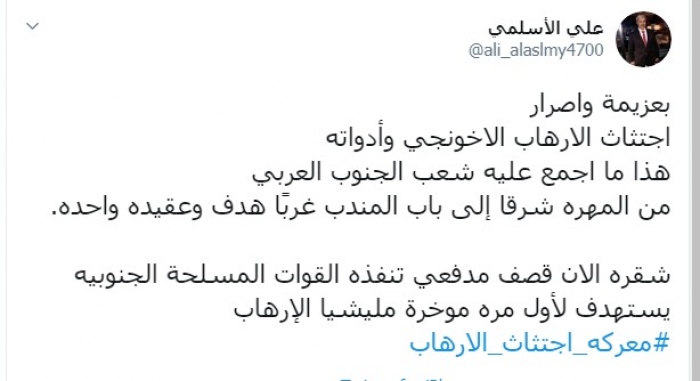وكتب عبر تغريدة له على "تويتر" رصدها " المشهد العربي": "بعزيمة وإصرار، اجتثاث الإرهاب الإخونجي وأدواته، هذا ما أجمع عليه شعب الجنوب العربي، من المهرة شرقًا إلى باب المندب غربًا هدف وعقيدة واحدة".