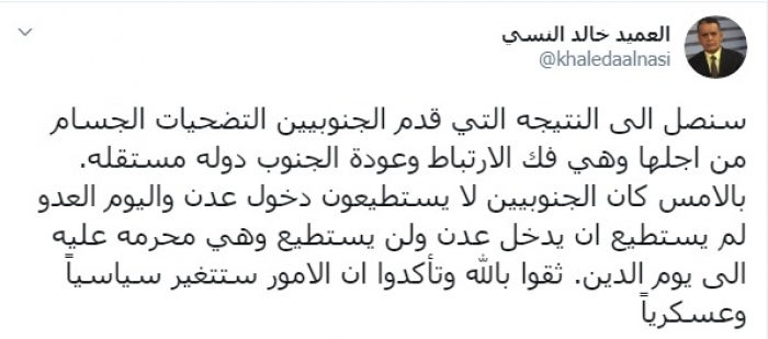 النسي: قريبا فك الارتباط وعودة الجنوب دولة مستقلة