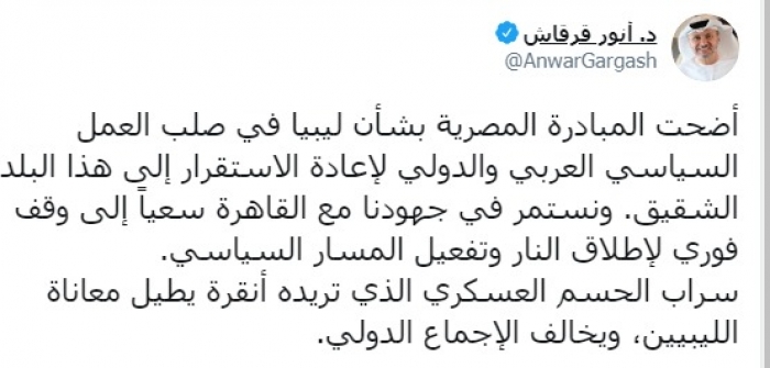 وكتب عبر تغريدة له على "تويتر" رصدها " المشهد العربي": "أضحت المبادرة المصرية بشأن ليبيا في صلب العمل السياسي العربي والدولي لإعادة الاستقرار إلى هذا البلد الشقيق، ونستمر في جهودنا مع القاهرة سعياً إلى وقف فوري لإطلاق النار وتفعيل المسار السياسي".