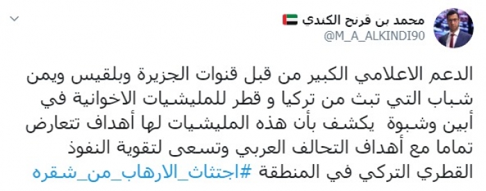 وكتب عبر تغريدة له على "تويتر" رصدها " المشهد العربي": "الدعم الإعلامي الكبير من قبل قنوات الجزيرة وبلقيس ويمن شباب التي تبث من تركيا و قطر للمليشيات الإخوانية في أبين وشبوة يكشف بأن هذه المليشيات لها أهداف تتعارض تمامًا مع أهداف التحالف العربي وتسعى لتقوية النفوذ القطري التركي في المنطقة".