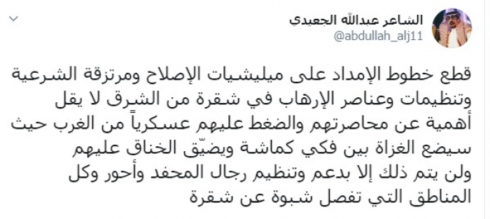 طالب الشاعر عبد الله الجعيدي، اليوم الخميس، بقطع الإمدادات على مليشيات الإخوان الإرهابية التابعة للشرعية في شقرة.