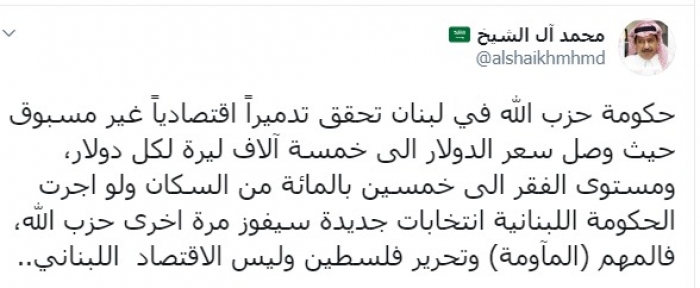 وكتب عبر تغريدة له على "تويتر" رصدها " المشهد العربي":"حكومة حزب الله في لبنان تحقق تدميرًا اقتصاديًا غير مسبوق حيث وصل سعر الدولار إلى خمسة آلاف ليرة لكل دولار، ومستوى الفقر إلى خمسين بالمائة من السكان، ولو أجرت الحكومة اللبنانية انتخابات جديدة سيفوز مرة أخرى حزب الله، فالمهم (المآومة) وتحرير فلسطين وليس الاقتصاد اللبناني".
