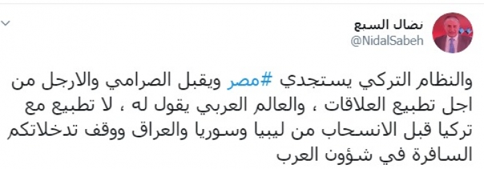 وكتب عبر تغريدة له على "تويتر" رصدها " المشهد العربي": "والنظام التركي يستجدي مصر ويقبل.. والأرجل من أجل تطبيع العلاقات ، والعالم العربي يقول له ، لا تطبيع مع تركيا قبل الانسحاب من ليبيا وسوريا والعراق ووقف تدخلاتكم السافرة في شؤون العرب".