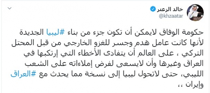 أكد المحلل السياسي السعودي، خالد الزعتر، اليوم الخميس، أن ما تسمى حكومة الوفاق الإرهابية لا يمكن أن تكون جزء من بناء ليبيا الجديدة.