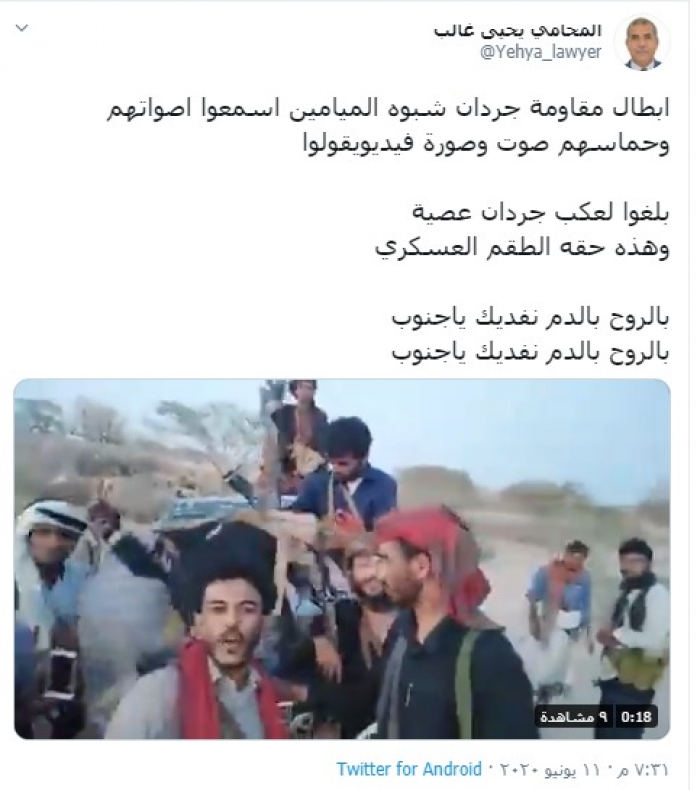 وكتب "غالب" في تغريدة عبر حسابه بتويتر، رصدها "المشهد العربي": "أبطال مقاومة جردان شبوة الميامين اسمعوا أصواتهم وحماسهم صوت وصورة فيديو يقولون