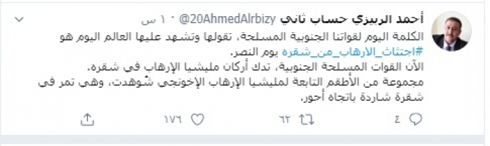وكتب "الربيزي" في تغريدة عبر حسابه بتويتر، رصدها "المشهد العربي": "الكلمة اليوم لقواتنا الجنوبية المسلحة، تقولها وتشهد عليها العالم اليوم هو #اجتثاث _ الإرهاب _ من _ شقرة، يوم النصر".