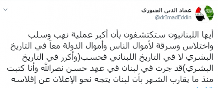 وكتب عبر تغريدة له على "تويتر" رصدها " المشهد العربي":" أيها اللبنانيون ستكتشفون بأن أكبر عملية نهب وسلب واختلاس وسرقة لأموال الناس وأموال الدولة معاً في التاريخ البشري لا في التاريخ اللبناني فحسب(وأكرر في التاريخ البشري)قد جرت في لبنان في عهد حسن نصرالله وأنا كتبت منذ ما يقارب الشهر بأن لبنان يتجه نحو الإعلان عن إفلاسه".